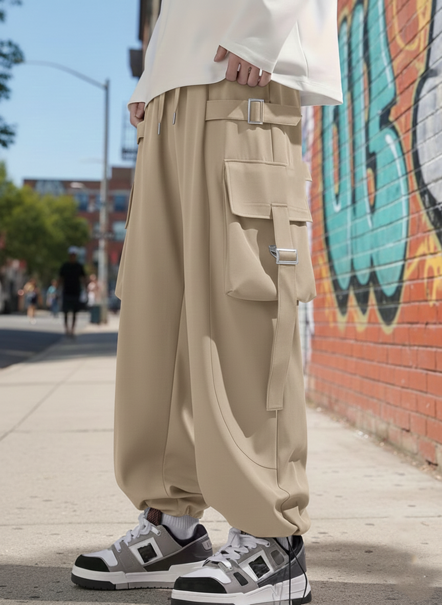 offers a wide-leg fit with utility-inspired side pockets and sleek panel
